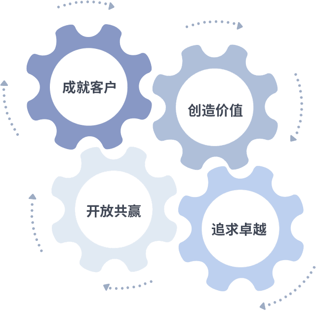 成就客户是一切决策的出发点,,,创造价值是衡量所有工作的标准,,,追求卓越是我们做事做人的态度,,,开放共赢是我们的格局也是最终的结果。。。。价值观的齿轮环环相扣,,推动着组织里的每个人不断向前。。