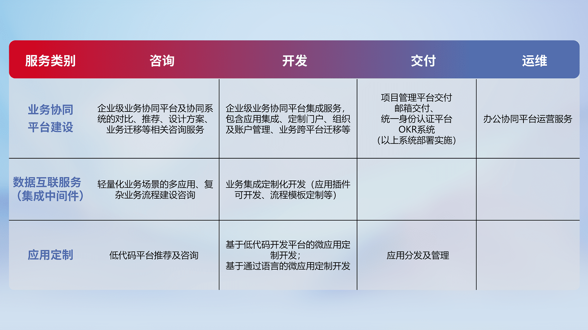 针对钉钉、、企微、、、、IDaas等平台级产品提供产品的规划、、、、方案、、、交付、、、定制化开发等服务,,,,实现如统一协同办公、、、智能客户服务、、混合会议管理、、智能数据查询、、、等业务场景,,实现数字化转型。。